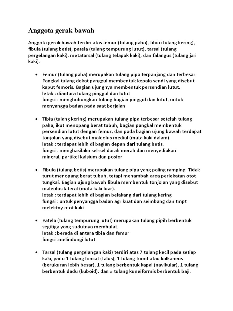 Bagian ini terdiri dari falanges dan metatarsal. Berikut ini cara merawat persendian tersebut agar tidak mudah cedera. Tulang kaki dimulai dari panggul hingga lutut, dinamakan tulang paha atau femur. Awali pijatan dengan teknik lembut dan gunakan tekanan ringan di dekat tulang dan area sensitif. Tulang tengkorak tengkorak terdiri dari sambungan kontinu.